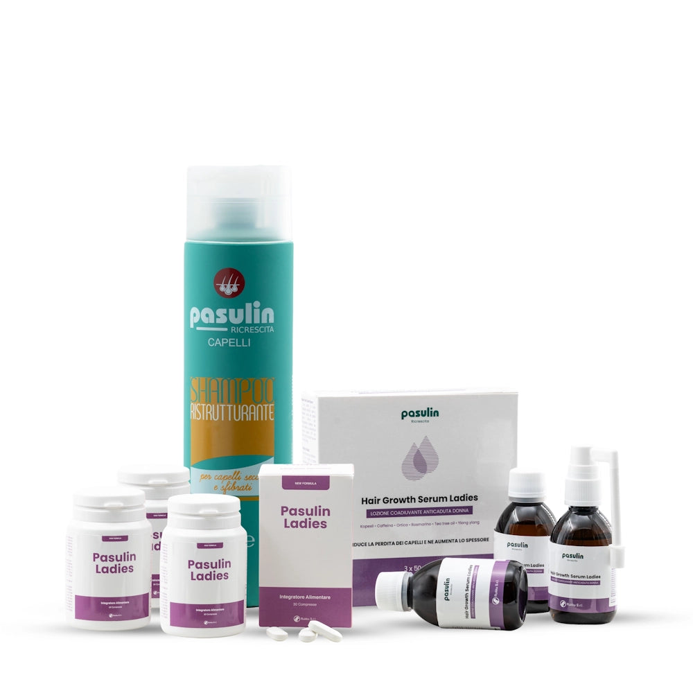 L’azione interna per combattere la perdita di capelli femminile è svolta dal Pasulin Ladies, l’integratore specifico per la donna che unisce i più potenti principi attivi vegetali anti-caduta in un unico prodotto specifico per combattere l’alopecia androgenetica femminile e stimolare i processi di cheratinizzazione dei capelli.